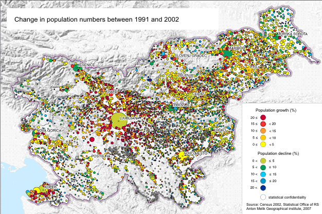 The drafting of strategic documents and legislation to ensure a healthy living environment and sustainable development is a task assigned to the Ministry of the Environment and Spatial Planning, and their implementation, including the issuing of permits and monitoring of the state of the environment, is the task of the Environmental Agency of the Republic of Slovenia (ARSO). A supervisory role is also played by another body attached to the ministry, the national Inspectorate of the Republic of Slovenia for the Environment and Spatial Planning. Ensuring the drinking water supply, treatment of municipal wastewater and the managing of municipal waste and some natural resources of local importance, including spatial planning, fall within the jurisdiction of local communities - the 210 municipalities. Figure 4: Number of inhabitants of Slovenia 1954–2008 Figure 5: Change in population numbers between 1991 and 2002 Figure 6: Population density What are the major societal trends?Slovenia a successful new EU member state Historical background Central planning and self-management socialism